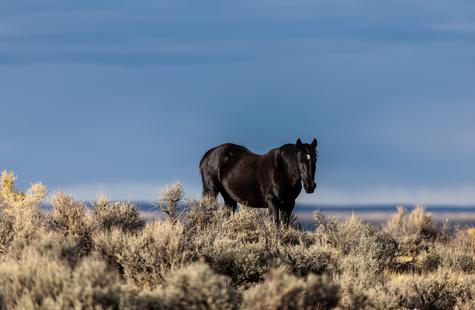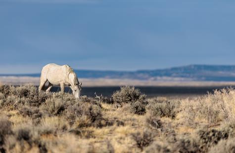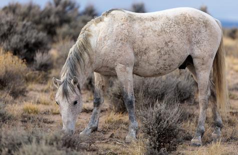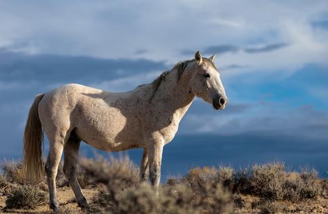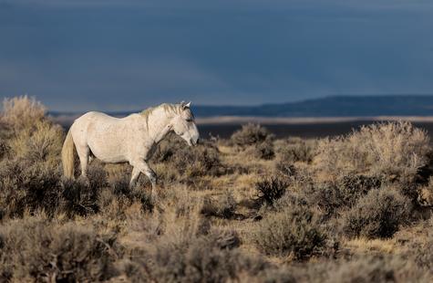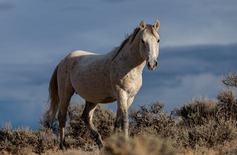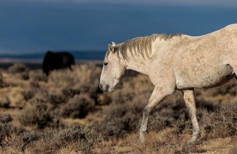 The brown freckles and subtle marks on this white mustang make him easy to remember. I could see him, more than any other horse, looking my direction regularly. He would glance then graze. At first he slowly drifted my way, but soon he just decided to come right over to me. After a brief moment checking me out at close range, he drifted back towards the larger group. An instant later, the light was gone for the day.