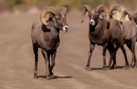 On the way back though, the light steadily improved and eventually I stumbled upon a really nice group of bachelors on the trail. The canyon "trail" is really just a big dirt road that's closed off to cars, and it's a very popular spot for hikers, bikers and runners. The bighorn are accustomed to the locals and the locals are used to the bighorn, so everyone pretty much just goes on about their business when the sheep join the people on the trail-road.