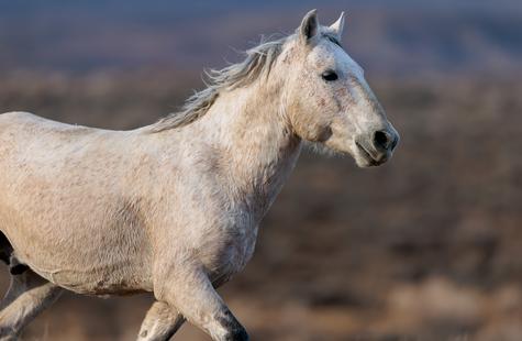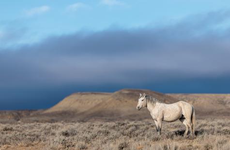 The brown freckles and subtle marks on this white mustang make him easy to remember. I could see him, more than any other horse, looking my direction regularly. He would glance then graze. At first he slowly drifted my way, but soon he just decided to come right over to me. After a brief moment checking me out at close range, he drifted back towards the larger group. An instant later, the light was gone for the day.