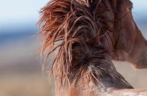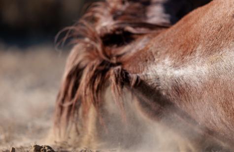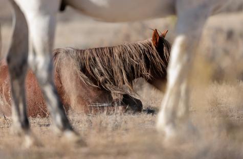 Stunningly, they decided to roll around in the dirt directly behind me. I was focused on six other horses that had just followed the first four, and I could not believe my ears when I heard the closest horse lie down and begin to roll around right next to me. It all happened rather fast, and because I was seated and didn't want to spook any horses -- it was an awkward attempt to quickly turn around to try and catch a shot that was only ~15 ft away. My big lens isn't intended for such close range, hence the inability to widen the shot or depth of field in the closest shots. Despite the limitations of the big lens, I love the frame as the mustang begins to shake off the dust while rising to his feet.