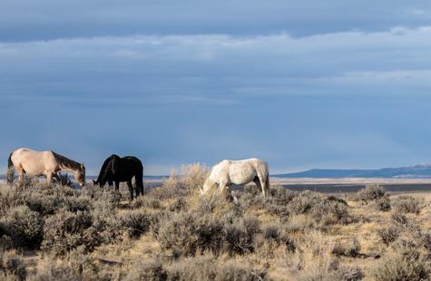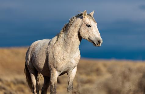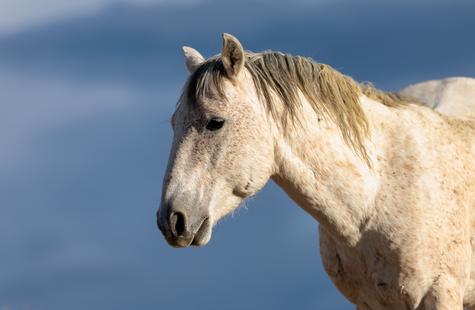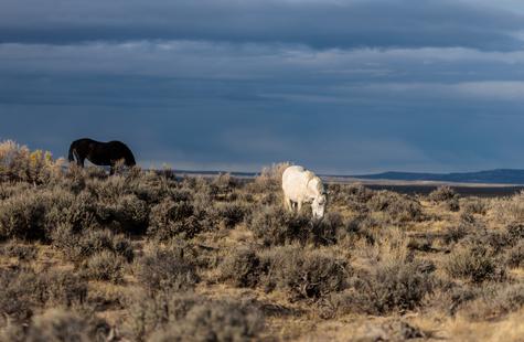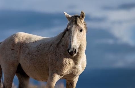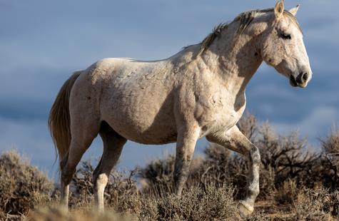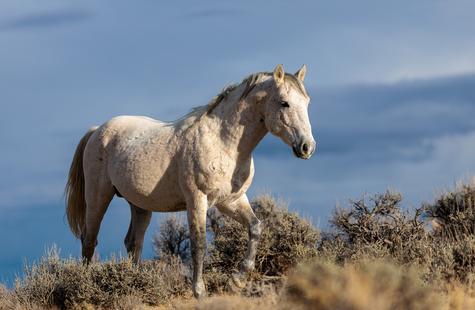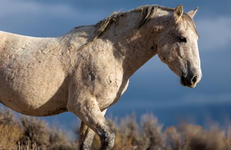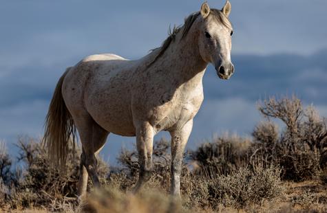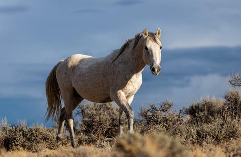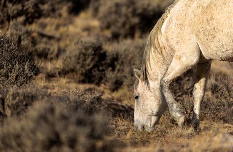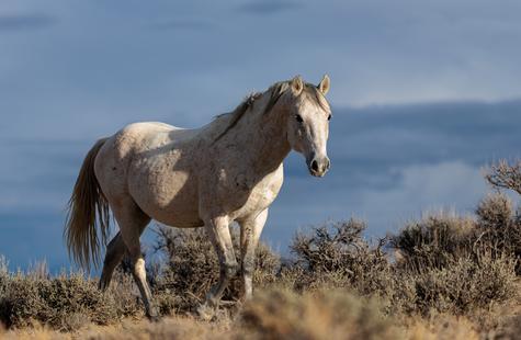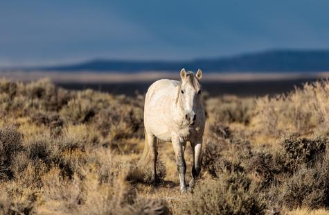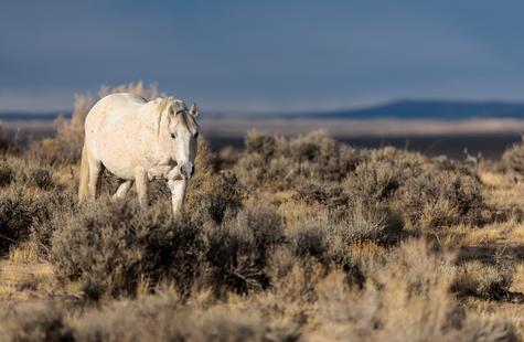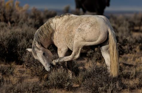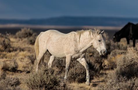The brown freckles and subtle marks on this white mustang make him easy to remember. I could see him, more than any other horse, looking my direction regularly. He would glance then graze. At first he slowly drifted my way, but soon he just decided to come right over to me. After a brief moment checking me out at close range, he drifted back towards the larger group. An instant later, the light was gone for the day.