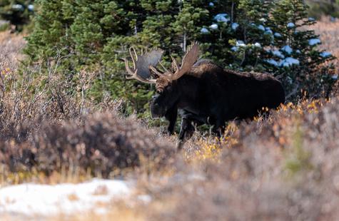 Super impressive bull. Not the biggest that I've ever seen in Colorado, but perhaps in the top 10 that I've photo'd thus far in the state. His antlers show signs of a few serious battles, but judging by everything else I would guess that he's often winning those battles. At his closest, I would estimate he was 40-50 feet away. Fun encounter.